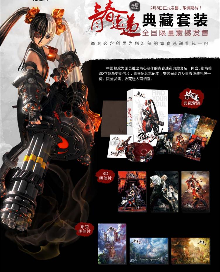随着“剑灵时代”的到来,中国邮政为剑灵开放测呐喊助威,共同推出了精心制作的青春速递典藏套装,据悉,青春速递典藏套装内含6张精美的3D立体渐变明信片,青春纪念笔记本,《剑灵》游戏正版安装光盘以及青春速递礼包一份。《剑灵》官方相关人员透露,整套套装初定价格为108元,但仅是套装内的游戏产品价值就有120元。