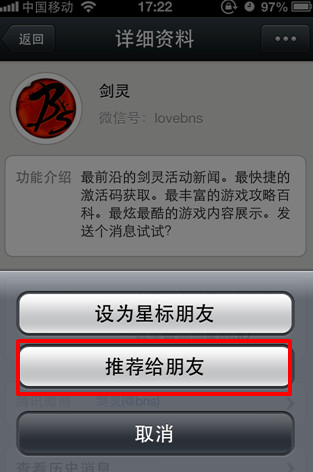 第一步:即日起至5月2日,通过发送名片的方式将剑灵微信推荐给3位从未添加过剑灵微信的朋友。