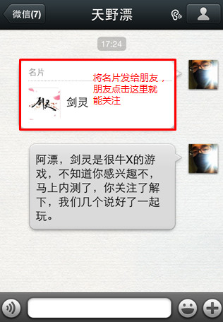 4.推荐后好友点击你送的名片就可以关注。