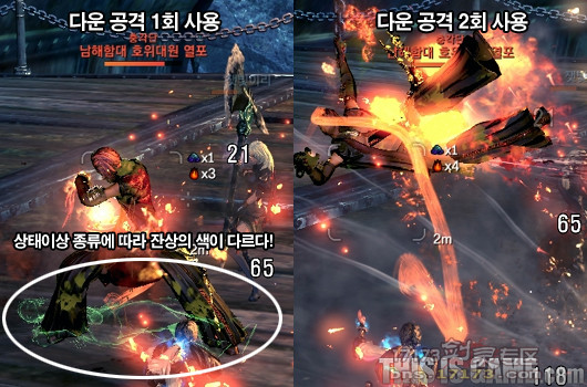 队员们可以从怪物身上发出的‘幻影’来区分它中的异常状态,不同的异常状态出现的‘幻影’颜色也不同。在这个‘幻影’消失之前使用同样的状态异常技能这个‘合击技’就算成功了。