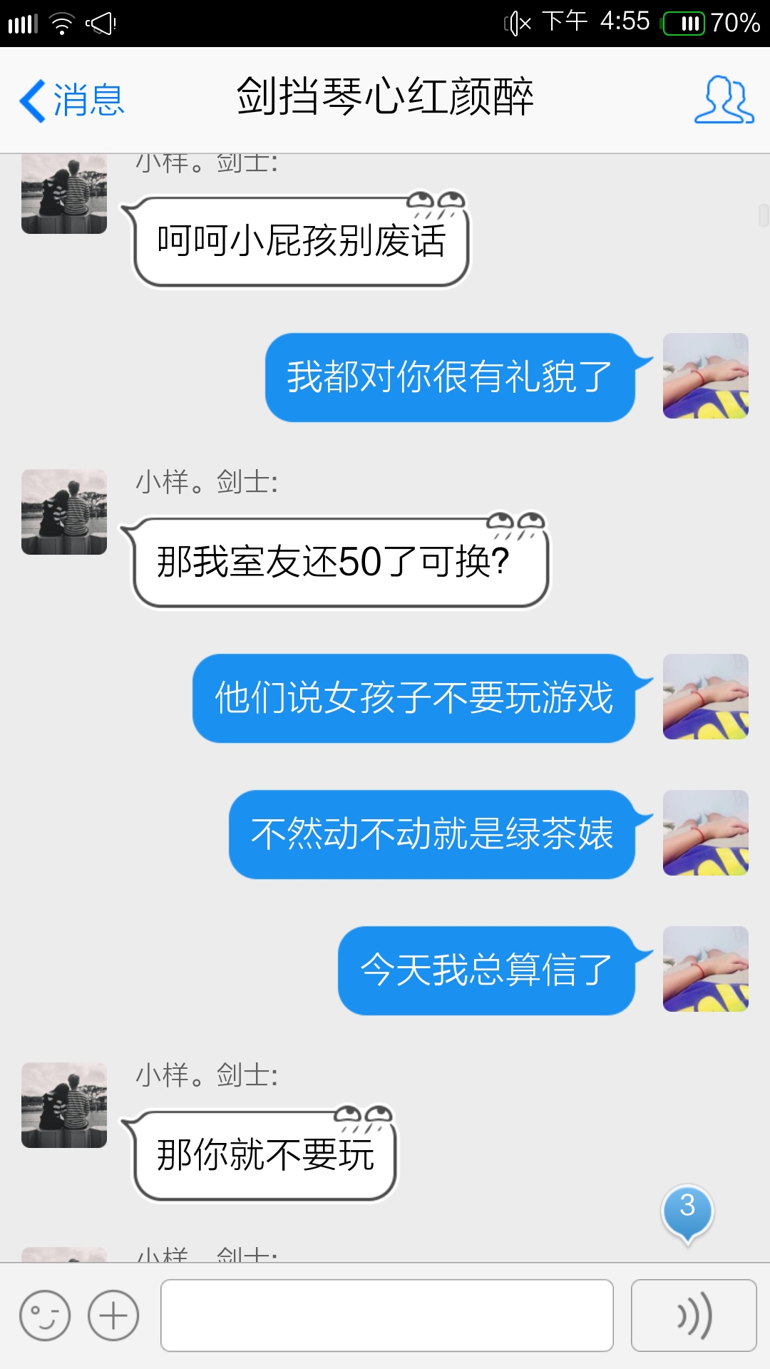 今天好好的,告诉门主有个很低级的小号而且很久没玩,要求T掉,于是不知道是有个男的看我不爽还是怎么回事,竟然骂我绿茶婊,当时楼主就气哭了, 本来想和他好好的解释,但是到后面他把我说他的那句放进贴吧里,自己骂我的完全不截,楼主真的很生气,这就放图