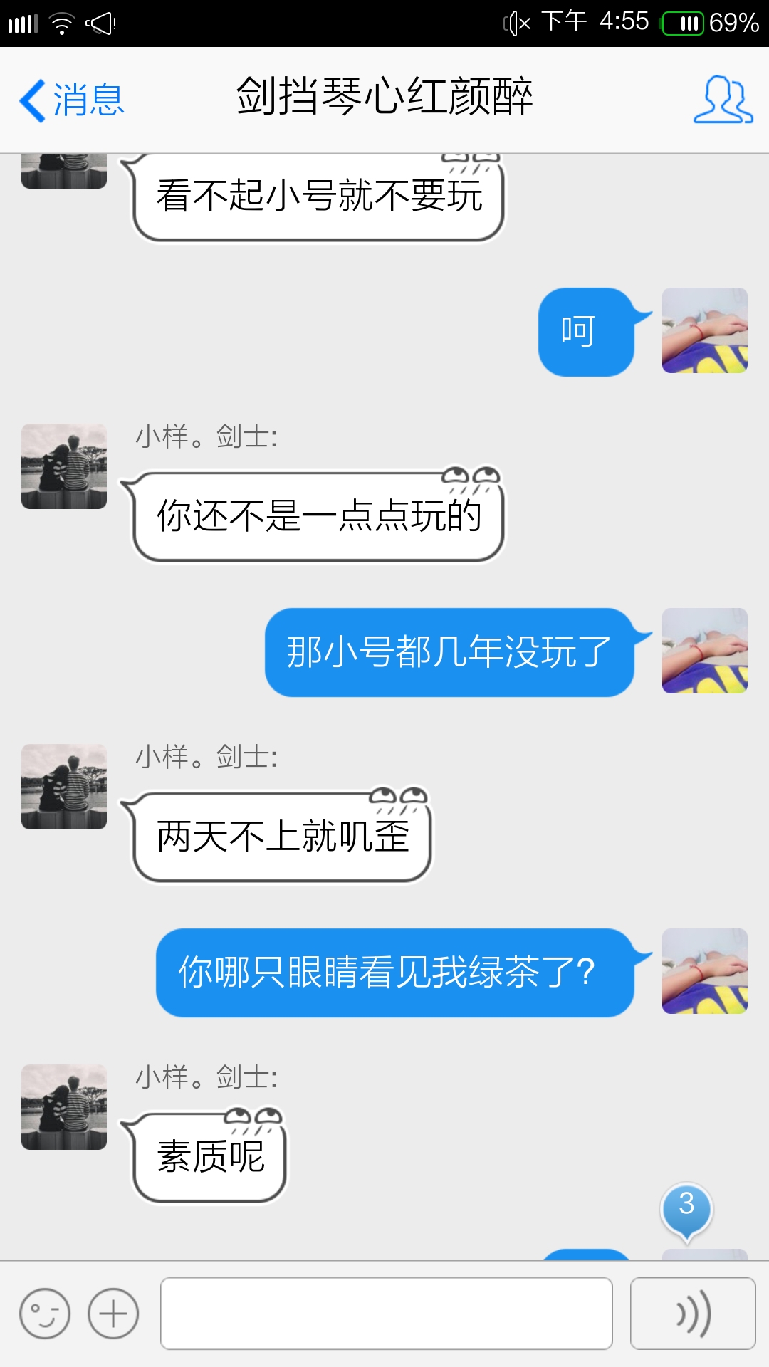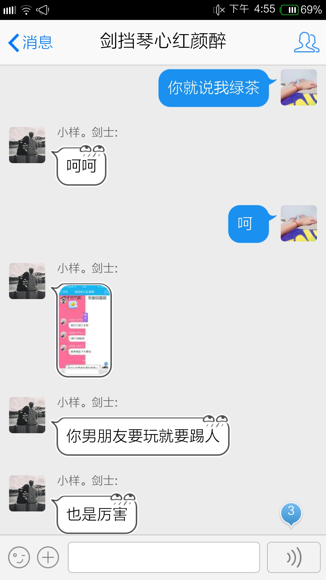 事情的经过大致就是这样,妹子看一个小号两天没上要求踢掉,不然就走。一个汉子就说妹子是绿茶婊,然后两个人就吵了这么29张图出来。