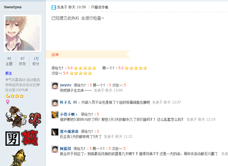 人有一把祝福5段的咸鱼,怕不怕,你就说怕不怕。而且南天国武器也出了bug,跟上次一样,不拿下来就不会过期。于是,土豪不愿意了,论坛炸翻天,为毛我们掏钱做的S3现在都被屌丝超越了,不服不服。最后无奈,版主回复了