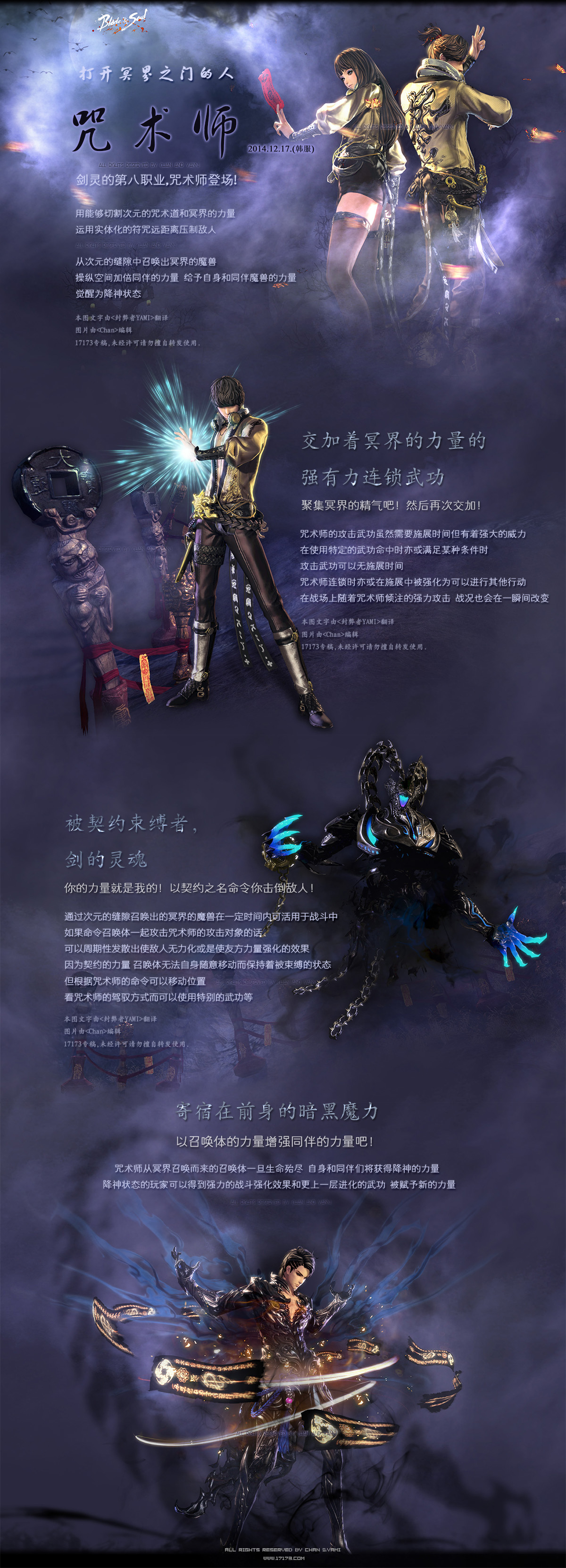 韩服已于11月22号公布了新职业咒术师,并将于12月17号上线。国服在TGC上也同步公布了新职业,并且通过各种活动表明,国服的咒术师即将 在2015年1月同步韩服。