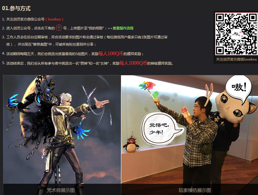 4.活动期间每隔五天,我们会挑选出质量最高的5组图片,奖励每人100Q币的膜拜奖励;